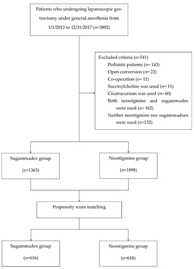 Data from the 3802 patients receiving laparoscopic gastrectomy under general anesthesia at Seoul National University Bundang Hospital between January 2013 and December 2017 were analyzed retrospectively. We excluded patients under 20 years old, those with conversion to laparotomy, and those with other surgeries. In addition, we excluded cases in which succinylcholine or cisatracurium was used, both sugammadex and neostigmine were used, or neither was used.
