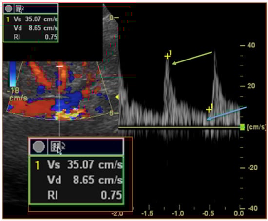 Intrarenal Doppler Ultrasonography: Renal Resistive index measurement technique. A sample volume is placed within an interlobar artery using Colour Doppler guidance. Spectral analysis of vascular signals is then obtained, and measurement callipers are set as follow: (i) systolic peak (green arrow); (ii) end diastole peak (blue arrow). Renal Resistive index is then calculated according to the formula (Vs − Vs)/Vs.