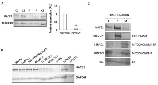 HACE1 protein expression analysis in patient fibroblasts and human tissues. (A) Western Blot analysis showed almost absent expression of HACE1 in patient fibroblasts. Extracts from several controls (C1: control 1; C2: control 2 and C3: control 3) and two different extracts from the patient were analysed. Tubulin was used as the loading control. ** p < 0.01. (B) Protein expression analysis in human control tissues showed a predominant HACE1 expression in brain samples. Glyceraldehyde-3-phosphate dehydrogenase (GAPDH) was used as the loading control. (C) Fractionation studies performed in control fibroblasts showed that HACE1 is mainly localized in the cytoplasmic fraction. Protein markers of different organelles (mitochondria, endoplasmic reticulum (ER) and cytoplasm) were studied in order to corroborate proper fractionation. The ER marker (PDI) showed a cytosolic leakage, a phenomenon already observed for this marker [26,27,28]. T: total extract; C: cytoplasmic extract; M: membranous organelle-enriched fraction extract.