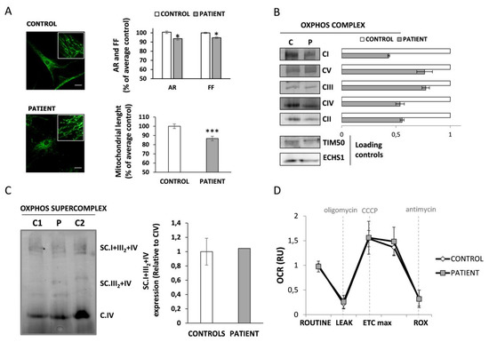 The mitochondrial morphology and mitochondrial network were analysed by immunofluorescence followed by confocal microscopy. Cells were grown on glass coverslips, fixed with 4% paraformaldehyde and the reaction was stopped using NH4Cl. Fibroblasts were permeabilized with 0.1% TritonX-100 and mitochondria were stained using anti-TOM20 antibody (Table S1), which recognises a mitochondrial membrane protein. Coverslips were mounted with Mowiol 4-88 Mounting Medium (81381 Sigma-Aldrich, Sant Luis, MI, USA) and images were obtained using a Leica TCS SL laser scanning confocal spectral microscope (Leica Microsystems GmbH, Wetzlar, Germany). Analysis was performed using ImageJ software [23]. Mitochondrial length, the ratio between mitochondria length and width (aspect ratio, AR) and the degree of mitochondrial network branching (form factor, FF) were calculated.
