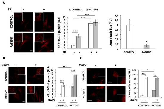 The fact that autophagy is a highly dynamic process made the rationale for the analysis of the autophagic flux in these cells, in addition to the above-mentioned determination of steady state LC3-II levels. Autophagic flux is defined as the process encompassing autophagosome formation to the delivery and degradation of autophagic substrates into the lysosome. To assess the autophagic flux, LC3 puncta was analyzed in the presence and in the absence of EP treatment, a strong inhibitor of the lysosomal hydrolases. This treatment blocks the degradation of autophagic substrates, including LC3-II, inside the autolysosome. Using this approach, we determined the amounts of LC3 particles which are delivered to lysosomes for degradation during EP treatment. As expected, our results showed that, upon EP treatment, the number of LC3-II puncta was significantly enhanced in both control and patient cells compared to their basal states (p < 0.001). Surprisingly, the fold increase in the number of LC3-II particles observed in HACE1 cells was lower (2.1-fold) than in control cells (7.9-fold), regardless of the higher levels observed at the basal state. Therefore, the autophagic flux, defined as the relative increase in LC3-II after EP treatment compared to the basal levels observed in untreated cells, was markedly reduced in HACE1 fibroblasts (Figure 3A, right panel).