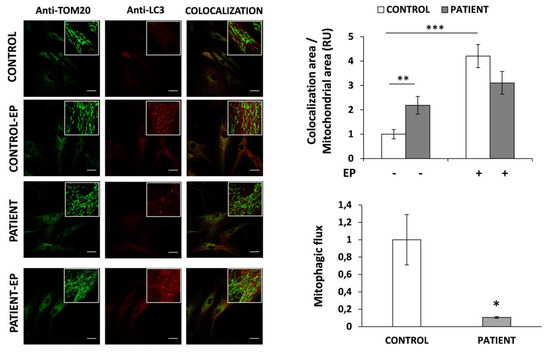Mitophagy was assessed by analyzing the colocalization between mitochondrial and LC3 areas, as described [24]. Coverslips were prepared as described above. In this case, we determined the colocalization areas using primary antibodies (Table S1) against LC3, staining autophagosomes, and TOM20, staining the mitochondria. Mitophagy was calculated as the LC3-II/TOM20 colocalization area related to the total mitochondrial area. To monitor the mitophagic flux, the ratio between mitophagy upon EP treatment and without treatment was analysed. We measured the relative increase in LC3-II/TOM20 colocalization areas upon 24 h of EP treatment compared to those detected in the basal state.