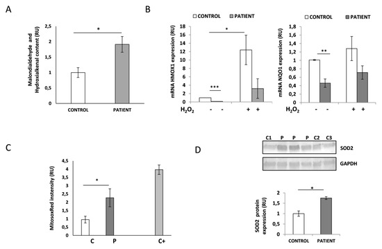 Analysis of oxidative stress in HACE1 patient fibroblasts. (A) The quantification of malondialdehyde and hydroxialkenal levels demonstrated higher levels of lipid peroxidation in HACE1 patient fibroblasts. P, patient; C1-C3, controls. * p < 0.05. (B) Quantitative PCR showed significantly decreased mRNA levels of HMOX1 and NQO1 at the basal state as well as upon oxidative stress induced by H2O2 in HACE1 patient. Experiments were performed in triplicate and results are expressed in relative units (RU). Peptidylprolyl isomerase A (PPIA) was used as an internal control. * p < 0.05, ** p < 0.01, *** p < 0.001. (C) Mitochondrial superoxide anion levels were analyzed by MitoSOXRed staining and flow cytometry. Increased levels of MitoSOXRed fluorescence intensity were detected in HACE1 patient fibroblasts. Cells treated with antimycin A were used as positive control. Results are expressed in relative units (RU). Patient (P); control (C); positive control (C+); * p < 0.05. (D) Western Blot analysis demonstrated higher levels of SOD2 protein expression in HACE1 patient fibroblasts. GAPDH was used as the loading control. Cell lysates from several controls (C) and four different extracts from the patient (P) were analyzed. * p < 0.05.