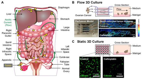 Ovarian cancer disseminates as individual cells or cell-clusters that exfoliate from the primary tumor and spread via transcoelomic, lymphatic, or hematogenous routes to distant sites [3,4,5,6,7,8,9,10]. Among these routes, transcoelomic metastases are the most common and are associated with the frequent production of malignant ascites as well as the highest morbidity and mortality rates [3,4]. Malignant ascites provide fluid-based routes for exfoliated tumor clusters and cells to spread throughout the peritoneum, as well as a nutrient- and chemokine-rich environment to promote the growth and motility of cancer cells [3,4,5]. Establishment of metastatic colonies in the peritoneum has a significant negative impact on survival outcomes and makes the disease exceptionally difficult to treat, with frequent recurrence [2,8,9,11,12,13,14]. Studies have shown that ascites contribute to tumor heterogeneity, modulate the expression of integrins, and alter the activity of matrix-degrading enzymes in ovarian cancer [5,11,15,16,17]. These effects by ascites on ovarian tumors have largely been studied in the context of the soluble factors (e.g., cytokines and metabolites) and cellular components (e.g., tumor cells and stromal cells) that are commonly found in ascites. In addition to providing a cell- and protein-rich environment for cancer growth and progression, ascitic fluid also confers physical stress, such as flow-induced shear stress, on tumors [18,19,20,21,22,23,24,25,26]. Natural currents of ascitic fluid result, in part, from organ mobility, changes in negative subdiaphragmatic pressure, gravity, and recesses formed by anatomical structures [4,27,28,29,30]. An area that remains understudied is the effect of fluid shear stress on response to chemotherapy and the modulation of molecular pathways associated with aggressive disease [11,16,17,31].