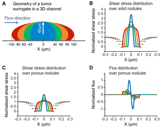 (A) Geometry of the micronodule located at the center of the microchannel. The flow velocity is in the X-direction. The nodule is modeled as an ellipse with a semi-minor axis of 40 μm in the Z-direction. The semi-major axis varies from 40-100 μm in the X-direction. The section over which the fluid dynamics are studied is the middle part of the channel with dimensions 4 mm along the Y-axis and 250 μm along the Z-axis. The nodule is located at (0, 20 μm). The black dotted line shows the centerline of the largest nodule. (B) Shear stress distribution over the surface of the solid micro-nodule on the XZ-plane. (C) Shear stress distribution over the surface of the porous micro-nodule on the XZ-plane. (D) Flow flux distribution over the centerline of the porous micro-nodule on the XZ-plane. The flux enters the surface at the left and leaves at the right.