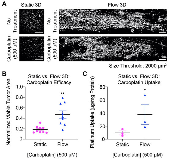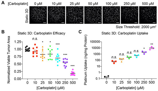 Figure 3B shows live tumor area following treatment with a range of carboplatin doses in static 3D cultures of ovarian cancer. The data represent normalized tumor area from an individual well (solid shapes), mean normalized tumor area (solid line) for three independent experiments in triplicate, and standard error of the mean (error bar). Treatment with 10 µM carboplatin resulted in non-significant changes in mean normalized tumor area (0.93 ± 0.04). Following treatment with 25 and 50 µM carboplatin, a modest and comparable, but significant, reduction in mean normalized tumor area was observed (0.82 ± 0.05 and 0.83 ± 0.06, respectively, p < 0.05). At a dose of 250 µM, the mean normalized tumor area was reduced to nearly half of the no treatment controls (0.55 ± 0.04, p < 0.05). A further increase in the dose to 500 µM carboplatin resulted in a > 80% tumoricidal effect (mean normalized tumor area: 0.18 ± 0.02, p < 0.05). Size distributions of adherent 3D ovarian tumors following treatment with 250 and 500 µM carboplatin are shown in Figure S2. Carboplatin causes cell death by irreversibly binding to DNA and inducing the formation of DNA adducts [87,88,89,90]. Accumulation of these adducts depends on the intracellular concentration of carboplatin. Therefore, intracellular concentration of carboplatin was quantified by ICP-MS (Figure 3C) for each of the doses used in the cytotoxicity studies (Figure 3B). A dose-dependent increase in carboplatin uptake was observed in the static cultures, ranging from 60.4 ± 14.08 ng/mg protein at 10 µM carboplatin (mean ± sem, n.s., p > 0.05) to 9774 ± 3052 ng/mg protein at 500 µM carboplatin (mean ± sem, p < 0.05).
