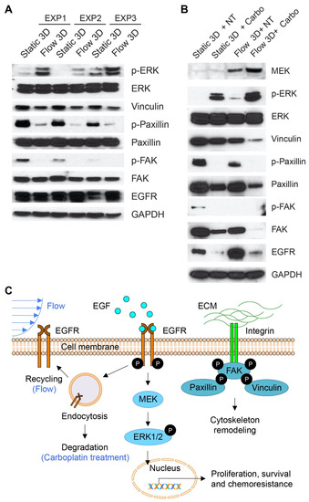 The EGFR/ERK signaling pathway is upregulated in many cancer types including ovarian cancer and is frequently implicated in treatment resistance [39,40,41,42,93]. It was previously shown that flow-induced mechanical stress mediates a post-translational increase in the expression of EGFR in ovarian cancer cells. Phosphorylation of EGFR at Y1173 was also increased in ovarian cancer cells under flow compared to static culture [25]. Here, the role of this pathway in the carboplatin resistance, shown in Figure 4, was investigated in tumors grown under flow and static conditions and treated with carboplatin (Figure 5B). It was found that the expression of phospho-ERK1/2 (at Thr202/Tyr204) was dramatically increased in OVCAR-5 cells grown under flow compared to static cultures in all the experimental replicates, whereas the total ERK expression remained the same. Interestingly, phospho-ERK1/2 levels were further increased in cells treated with carboplatin in both flow and static culture groups (Figure 5B). ERK1/2 activity is modulated by the upstream kinase MEK (Figure 5C). An upregulation of total MEK levels was observed in cells grown under flow and further increased (Figure 5B) in cultures that were both grown under flow and treated with carboplatin.