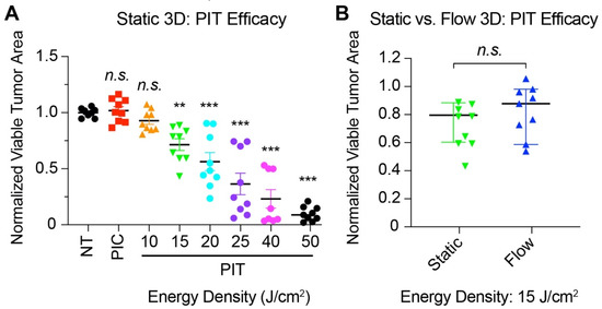 PIT efficacy in 3D tumors. (A) Dose-dependent change in normalized viable tumor area in static 3D cultures treated with PIC (1 μM BPD equivalent) and increasing energy densities (10–50 J/cm2 @ 50 mW/cm2). Significant tumoricidal efficacy is observed in a light-dose-dependent manner, starting at 15 J/cm2. (One-way ANOVA with Dunnett’s post hoc test; n.s., not significant; ** p < 0.01, *** p < 0.001, N = 9) (B) Comparison of cytotoxic response in PIT-treated 3D cultures under static and flow conditions. For quantitative analysis of fluorescence images, a minimum nodule size cut-off of 2000 µm2 (clusters of ~15–20 cells) was used to establish normalized viable tumor area. PIT is equally effective in 3D tumors grown in static cultures (green) and under flow-induced shear stress (blue) (in contrast to flow-induced chemo-resistance shown in Figure 4) (Two-tailed t test; n.s., not significant; N = 9).