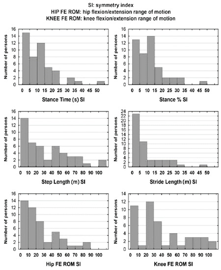 The analysis of the SI values identified for the specific parameters and the related graphic presentation suggest that a considerably greater relative differences between the two limbs are found in the parameters of Step Length (s), Hip FE ROM, and Knee FE ROM (Figure 1).