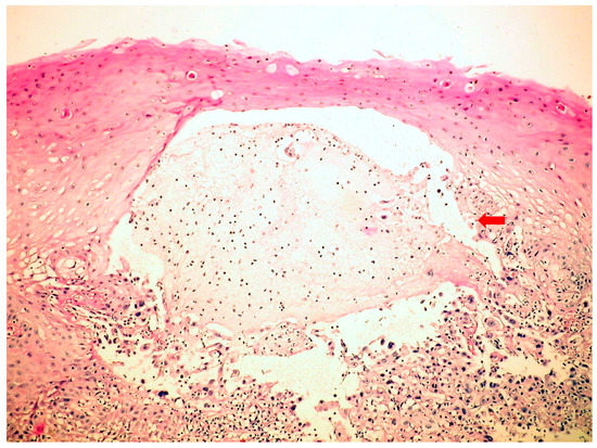 Herpes simplex virus (HSV)-inducedesophagitis (microscopy-HE, 400×) with serous vesicle formation.