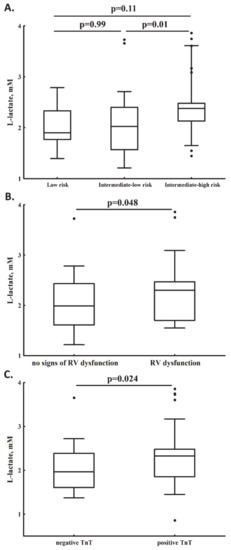 Plasma lactate levels determined in acute pulmonary embolism patients with low, intermediate–low, and intermediate–high early mortality risk (panel A, p < 0.05 for ANOVA) as well as in subjects with or without right ventricular (RV) dysfunction (panel B), and in those with positive or negative troponin T (TnT; panel C).