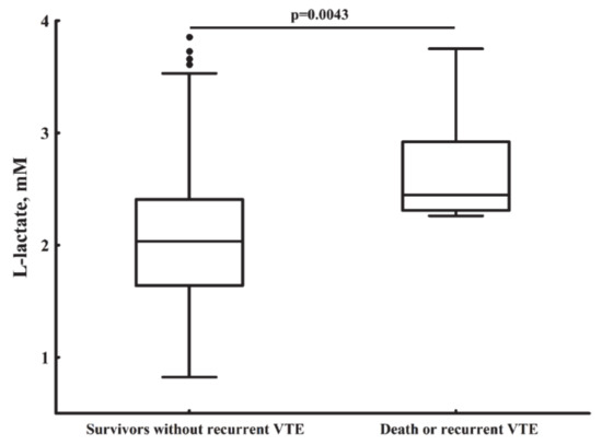 Plasma lactate levels assessed on admission in survivors without recurrent venous thromboembolism (VTE) vs. patients who died due to acute pulmonary embolism or its complications or experienced recurrent VTE during 1 year follow-up.