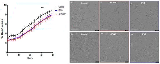 An image-based assay of Cell Proliferation in a live-cell analysis system (IncuCyte S3, ESSEN BioScience, Royston, UK) was carried out. The neuroblastoma cell line Neuro2A (N2A, ATCC CCL-131) was cultured in DMEM containing GlutaMax and supplemented with 10% FBS until they reached 20–40% confluence in the first acquisition. After that, they were exposed to IFN-ß (100 U mL−1) or recombinant sIFNAR2 (100 ng mL−1) (6 wells per condition) during 40 h (conditions previously established). A non-stimulated control was also included. The IncuCyte was automatically acquired every two hours, 4 images per well, and these images were analyzed, providing data on the percentage of cell confluence (IncuCyte® S3 Live-Cell Analysis System (Cat. No. 4763), ESSEN BioScience, Royston, UK)