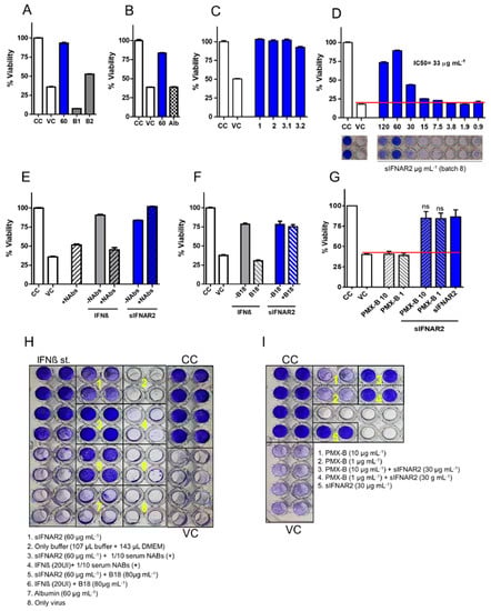 LPS control: in order to discard any possible effect of the residual LPS present in the recombinant sIFNAR2 preparation, Polymyxin B, which is an antibiotic that inhibits LPS, was used. The Figure 4G,I show that in the presence of polymyxin B there is no protection of the cell monolayer. However, the addition of polymyxin B to recombinant sIFNAR2 to block LPS did not affected its antiviral activity, which remained unchanged.
