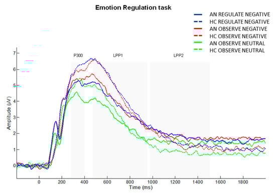 Previous ERP studies in the non-clinical population showed that the amplitude of the P300 and LPP components can be modulated by different emotion regulation strategies [30,31,32,33,34,35,36,37,38]. Due to the clinical relevance of emotions in daily life, numerous EEG studies have focused on down-regulation of P300 and LPP amplitudes in response to negative and positive emotions [30,31,32,33,34,35,36,37,38]. Although most studies point to a reduction of LPP amplitudes when participants try to down-regulate their negative emotions [30,31,32,33,39,40], other research studies have found no significant modulation of this component [35,38], or even a modulation in the opposite direction [41]. Focusing on the eating disorders field, several ERP studies have shown emotion regulation difficulties among individuals with comorbidities, such as anxiety disorders and alexithymia [42,43]. Nevertheless, no studies to date have examined ERP modulations by emotion regulation in specific eating disorder populations such as AN.