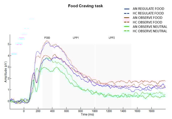 Furthermore, although ERP did not depict differential response between AN and HC while down-regulating emotions or food craving, reduced P300 mean amplitudes were detected in AN when compared to HC. This result might reflect a general alteration in the neurophysiological responses of AN patients, which is possibly related to their prolonged state of malnutrition [99]. In this regard, this study provides an objective parameter of those impairments which long-lasting malnutrition might be occasioning in the neural systems of AN patients. Previous research has also found neurophysiological dysfunctions in AN, which do not always seem to be normalised after weight gain [98]. In that respect, it would be of great interest that future studies explore not only if neurophysiological alterations remain or, on the contrary, are ameliorated after patients’ recovery, but also investigate the factors which might contribute to normalise neural responses in AN (e.g., weight gain, pharmacological treatments, specific psychological interventions, etc.).