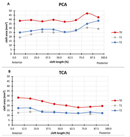 Median (A) palatal cleft area (PCA) and (B) true cleft area (TCA) at T0, T1, and T2 in eight equidistant quadrangles (0–12.5%, 12.5–25%, 25–37.5%, and so forth) from anterior to posterior.