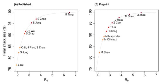 - Lipsitch, M.; Cohen, T.; Cooper, B.; Robins, J.M.; Ma, S.; James, L.; Gopalakrishna, G.; Chew, S.K.; Tan, C.C.; Samore, M.H.; et al. Transmission dynamics and control of severe acute respiratory syndrome. Science 2003, 300, 1966–1970. [Google Scholar] [CrossRef] [PubMed]