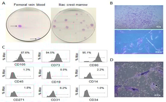 Identification and phenotype of putative MSC colonies. (A) Macroscopic image of fibroblast-like colonies isolated from femoral vein blood (FVB) compared to iliac crest bone marrow, (B) microscopic images of FVB colonies, (C) histograms from flow cytometry of plastic adherent culture-expanded cells isolated from FVB (D) alkaline phosphatase staining of putative MSCs following osteogenic induction.