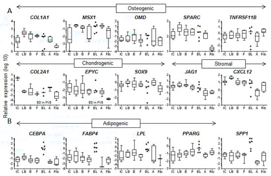 Differential expression of FV- and PV- blood-MSCs compared to other MSC types. A – Osteogenic, chondrogenic and stromal-support genes, B – adipogenic genes. FVB- and PVB-MSCs represented by standard and inverted triangles, respectively. Horizontal line = median (scatter and box/whisker), box/whisker = interquartile range/range, BD = below detection. IC = iliac crest marrow, LB = long bone marrow, B = control bone, P = periosteum, B = blood, A = adipose, Fib = fibroblast.
