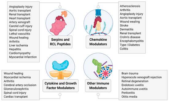 | vMIP-II | Herpesviruses | MIP-1α mimic | Cerebral artery occlusion; Anti-GBM glomerulonephritis; Spinal cord injury; Cardiac transplant | [148,149,150,151] |