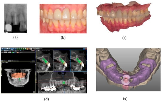 Surface registration protocol of implant planning. (a) A radiograph of a fractured left maxillary central incisor. (b) A temporary restoration for esthetics was fabricated on the root with fiber post and resin composite. (c) An image of maxillary and mandibular digital impressions after occlusal registration. (d) A cone-beam computed tomography (CBCT) image matched with an intraoral scan by dental surface registration algorithm, with ideal implant position planned (green). (e) A computer-aided design (CAD) image of the designed surgical guide.