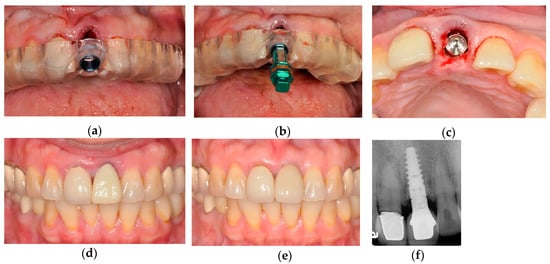 All the implant surgeries were performed by one experienced doctor (C.-C.L.). Before implant surgery, the SLA surgical guide was verified in the patient’s mouth for correct seating and stability. If adequate alveolar bone width (5 mm) and keratinized gingival tissue (4.5–5 mm) were available in the implant site, a flapless approach was performed after block or infiltration anesthesia application; otherwise, an open flap surgery was performed. All the guided surgeries were performed using the BenQ AB Guided Service System (BenQ AB DentCare Corp., Taipei, Taiwan). Drill keys with varying inner diameters and their corresponding drills were used sequentially. All drills had a physical stop on the top of the drill to allow depth control. Following the standard protocol of the surgical guide system, guided drilling procedures were executed, and implant fixtures were inserted through the surgical guide sleeve (fully guided insertion). Internal hex, bone level type implants (I5 Conical Implant, AB dental, Ashdod, Israel) with varying length (8–16 mm) and diameter (3.5–4.2 mm) were used for all patients. An example of clinical procedures is concisely presented in Figure 4.
