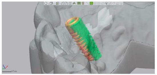 Because of the streaking effect of the metal artifacts, the implant image of the post-operative CBCT was ambiguous at this point, and the determination of the correct geometry could be challenging. Therefore, the data set was exported to a CAD software (Geomagic Design X, 3D Systems Inc., Rock Hill, SC, USA) in STL format. Using the best-fit algorithm of the software, the ambiguous post-operative implant image was then extracted and replaced by the CAD files corresponding to the placed implant. Hence, a virtual implant best fitted the geometry and the position of the post-operative implant image was attained, and the deviations between planned and placed implants could be measured more correctly, as seen in Figure 5.