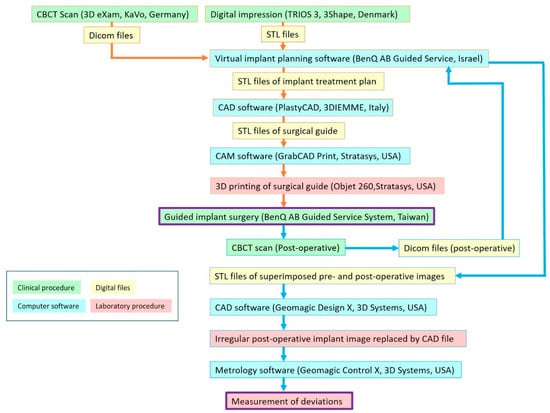 Summarized workflow of guided surgery (orange arrows) and deviation measurement (blue arrows).