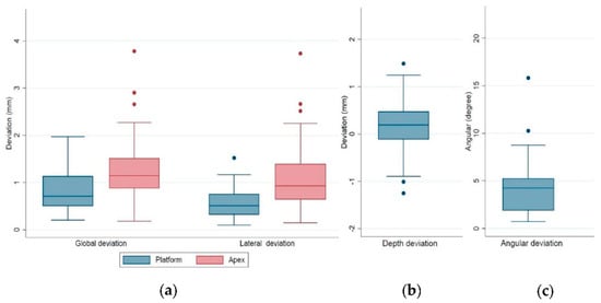 The distributions of the analyzed deviations are shown in detail in the box plots in Figure 8. In general, the deviations at implant apex were larger than at the implant platform: 75% of the values of the global/lateral deviation at the implant platform were below 1.13/0.75 mm (upper quartile, Figure 8a); 50% of the values of depth deviation were between +0.47 mm (upper quartile) and −0.11 mm (lower quartile, Figure 8b); and 75% of the values of the angular deviation were below 5.23º (upper quartile), with two outliers above 10º (Figure 8c).