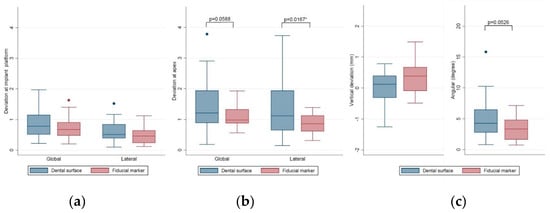 Figure 9 presents the distributions of deviations and the comparison between surface registration protocol and fiducial marker registration protocol. In general, implants planned with the surface registration protocol had larger values of global and lateral deviations at implant apex (Figure 9b), and angular deviations (Figure 9c, right) than implants planned with the fiducial marker protocol.