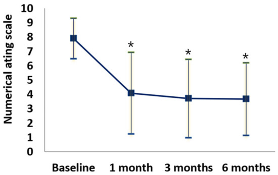 Numerical rating scale of lumbar radicular pain with or without lower back pain at baseline, 1, 3, and 6 months after combined epidural adhesiolysis and balloon decompression. * p < 0.001 versus baseline.