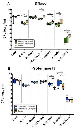 3.2. Counts of S. mutans, S. oralis and C. albicans Increased after Treatment with Proteinase K