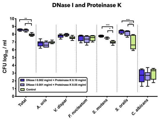 3.3. Combined Treatment with DNase I and Proteinase K Induced a Significant Increase in Total Bacterial, S. mutans, and S. oralis Counts