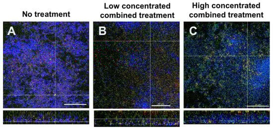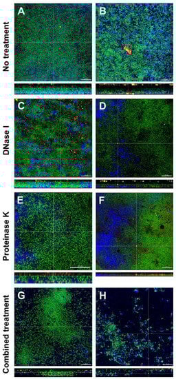 3.4. Combined Treatment with DNase I and Proteinase K Affected the Structural Integrity and Spatial Distribution of Biofilms
