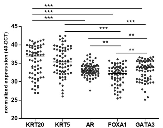 Distribution of normalized mRNA expression of KRT5, KRT20, FOXA1, GATA3, and androgen receptor (AR) in the Mannheim cohort (** p < 0.01; *** p < 0.001).