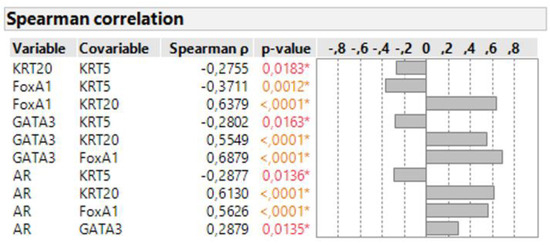 Spearman correlation demonstrated a significant positive association of FOXA1 and GATA3 with the luminal marker KRT20 (Figure 2). All three luminal markers showed a significantly negative association with the basal marker KRT5. Moreover, AR also showed a significantly positive association with all luminal markers, while the association between AR and KRT5 was negative.