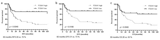 Kaplan Meier analysis for recurrence-free survival (RFS) (a), disease-free survival (DFS) (b) and overall survival (OS) (c) based on FOXA1 mRNA expression within the Mannheim cohort.