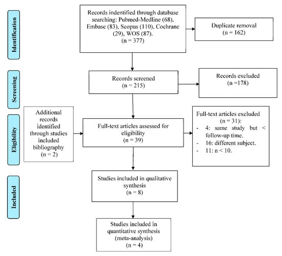 After reading the titles and abstracts, a further 178 were eliminated, because they did not meet the inclusion criteria (as most of them were in vitro studies or clinical case reports) or because they exposed a different subject to our study objective, leaving a total of 37 studies. Of these, 31 were rejected for 3 reasons: having a crown sample size less than 10 (n < 10), addressing a different question, or being the same study published prior to another one but with a smaller sample. Of the 6 remaining studies, 2 additional articles were added by way of the bibliographies of the studies included. Finally, 8 articles were included for the qualitative synthesis and a 4 for the quantitative synthesis or meta-analysis as all the necessary data and variables were present (Figure 1). Of the 8 studies included in the systematic review, one of them is a cohort study and the remaining 7 were clinical trials.