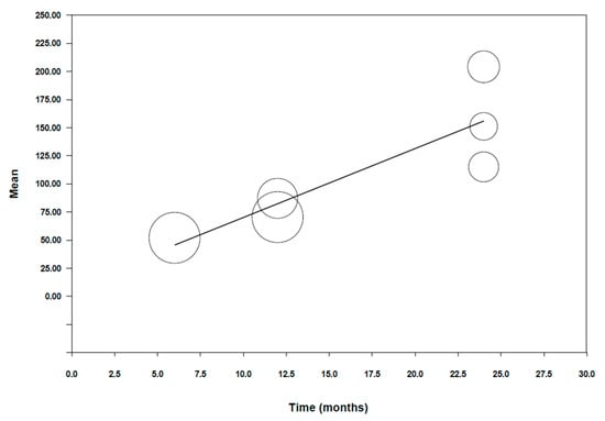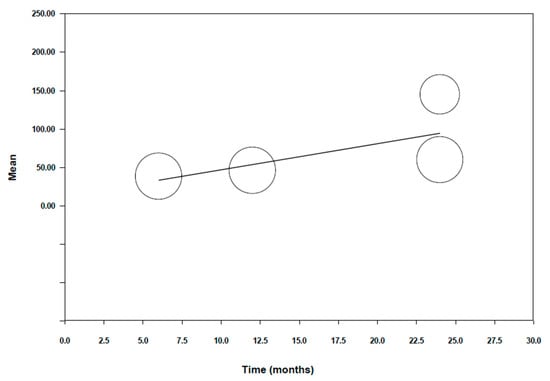 To explain the high heterogeneity detected, in a similar procedure to the previous meta-analysis, a meta-regression was carried out with the variable time (Figure 6). A significant model was obtained; Q test = 3.73 (p = 0.053). However, the level of significance is not very high. The beta coefficient of the intercept was 12.92 with a CI at 95% (−48.22–74.06), giving a predictive capacity of 53% (R2 = 0.53); p value = 0.68. The beta coefficient of time is 3.40, with a p value = 0.053 and CI at 95% (−0.05–6.85). We can therefore conclude that in this case, time is a significant variable in the model (sustaining a maximum wear of 3.40 microns per month with respect to monolithic zirconia crowns), however not as much as in the case of wear in the antagonist tooth.