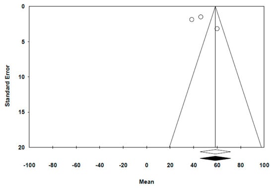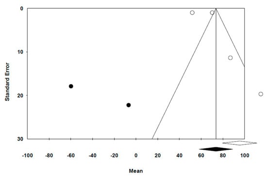 The funnel plot (Figure 7) depicts a distribution for the results of the studies. By using the trim and fill method, the new estimation of effect was not different to the original measurement (58.47 µm). By using Egger’s Test, we obtained a beta coefficient for the intercept: 7.07, with a CI at 95%, ranging from −7.06 to 21.2 (p = 0.164). The mean is situated between −5.63 and 14.73, indicating a low bias risk.