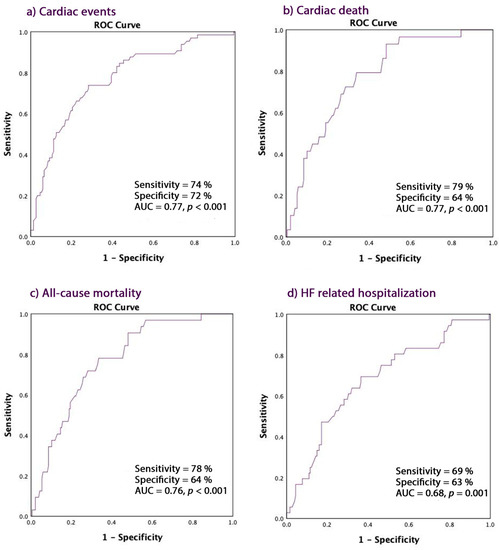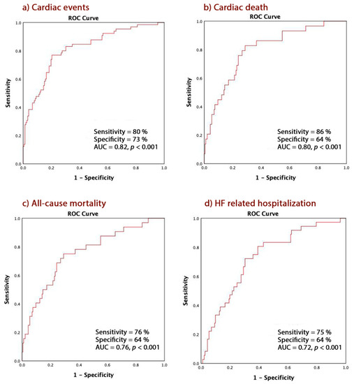 A PALS ≤ 16% predicted CE with the following accuracies: overall CE 74% sensitivity and 72% specificity (AUC 0.77, CI = 0.70–0.84, p < 0.001), cardiac death with 79% sensitivity and 64% specificity (AUC 0.77, CI = 0.62–0.81, p < 0.001), all-cause mortality with 78% sensitivity and 64% specificity (AUC 0.76, CI = 0.67–0.85, p < 0.001), and HF hospitalization (AUC 0.68, CI = 0.66–0.81, p = 0.001) with 69% sensitivity and 63% specificity (Figure 2a–d).