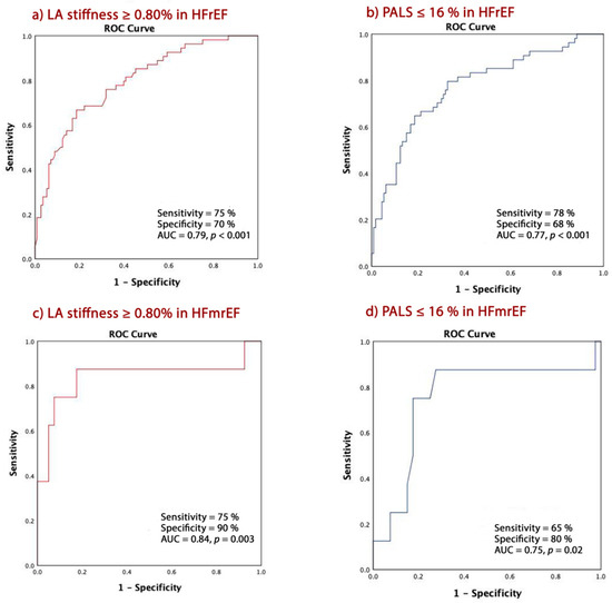 A LA stiffness ≥0.76% was 75% sensitive and 70% specific (AUC 0.79, CI = 0.72–0.86, p < 0.001) in predicting CE in patients with HFrEF and 75% sensitive and 90% specific (AUC 0.84, CI = 0.99–0.86, p = 0.003) in patients with HFmrEF (Figure 3a,c). PALS ≤ 16% had similar predictive powers for CE with 78% sensitivity and 68% specificity (AUC 0.77, CI = 0.69–0.85, p < 0.001) in HFrEF patients and 65% sensitivity and 80% specificity (AUC 0.75, CI = 0.54–0.96, p = 0.02) in those with HFmrEF (Figure 3b,d).