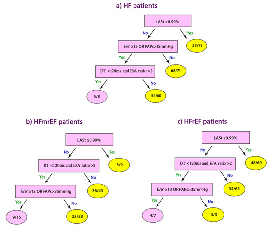Data are summarized using frequencies (percentages) for categorical variables and mean ± standard deviation for continuous variables or median interquartile (IRQ) ranges, when appropriate continuous data were compared with two-tailed Student t-test and discrete data with Chi-square test. Correlations were tested using Pearson coefficients. Predictors of cardiac events were identified with univariate analysis and multivariate logistic regression which was performed using the step-wise method. CART analysis was used to generate the best decision tree in predicting CE. The following predictors of CE were considered in the analysis: LASt ≥ 0.99%, E/e’ ≥ 13 OR PAPs > 35 mmHg and LV filling pattern (defined as DT < 120 ms and E/A ratio > 2). The diagnostic accuracy of the CART algorithm was compared with that of individual parameters using the exact binomial test. The relative increases in accuracy observed in patients with HFrEF and HFmrEF were compared using the Fisher exact test.
