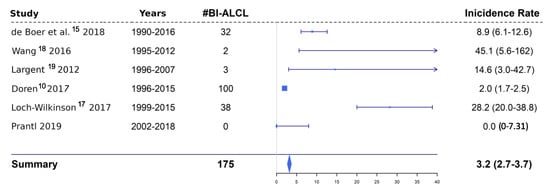 A few other studies have investigated the incidence of primary breast ALCL [11,29,30,31]. Based on the National Cancer Institute´s Surveillance Epidemiology and Results (SEER) program, Altekruse et al. reported an incidence rate of 3 per 100 million per year (p < 0.05). From 2011 onward, a steadily increasing incidence rate from 1 to 3 per 1 million person-years was suspected to result from over-reporting and increasing awareness [10,32].