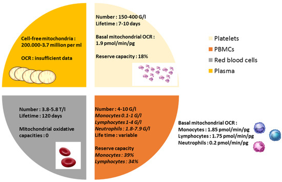 Interestingly, despite red blood cells being present with no mitochondria in human, a recent report showed a presence of structurally cell-free competent mitochondria in blood circulation [22]. Circulating peripheral blood cells and plasma characteristics and bioenergetics are presented in Figure 1.