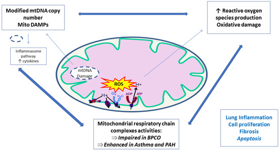 Lung diseases, especially chronic obstructive pulmonary disease (COPD), asthma, pulmonary arterial hypertension (PAH), and/or idiopathic pulmonary fibrosis (IPF) are main causes of mortality, resulting in significant health and economic burdens worldwide. Indeed, the prevalence of COPD is increasing with 64 million persons concerned in the world, and according to the latest WHO estimates, it will rise as the third leading cause of death by 2030 [1]. Asthma is the most common chronic disease among children, affecting around 235 million persons [2]. PAH or IPF are less common but are characterized by poor prognosis [3,4]. Based on this evidence, it appears important to gain new insight into lung diseases pathophysiology and to analyze potential biomarkers to better reveal lung function, diagnose, and predict the prognosis of these diseases. As observed during cardiovascular diseases, mitochondrial dysfunctions deserve to be further studied, both at the local and at the circulating levels [5]. Indeed, mitochondrial abnormalities are involved in lung diseases but direct evidence of mitochondrial dysfunction in human studies is limited, because of the difficulty to biopsy tissues in these frail patients.