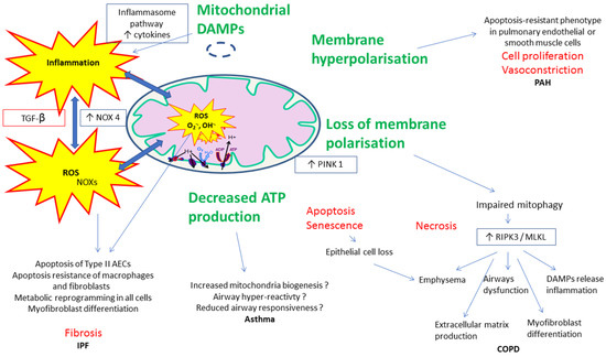 Mitochondrial dysfunction associated with lung inflammation and oxidative stress contributes to COPD, asthma, PAH, and idiopathic pulmonary fibrosis. To allow adequate function and maintenance of intracellular homeostasis, mitochondria rely on quality control pathways (mitochondrial biogenesis, fusion/fission, mitophagy…), and their alteration disrupts organelle metabolism and biogenesis, inflammation adequacy, and even innate immunity. The general concept that enhanced oxidative metabolism drives toward an anti-inflammatory response and that shifting toward a glycolytic metabolism favor an inflammatory response varies depending on the cells. Mitochondria are also platforms for pattern recognition receptors signal transduction and mediators in effector responses. Thus, mitochondrial DAMPS can activate the NRLP3 inflammasome, resulting in proinflammatory cytokine release. They act as the danger signal recognized by immune receptors [131,143,144]. Accordingly, for instance, TLR9 is involved in mtDNA induced in acute and chronic lung inflammation, through the TLR9-p38 MAPK pathway and STING pathway, respectively [145]. All pulmonary cell types are involved in the triad mitochondrial dysfunction–inflammation–enhanced ROS production.