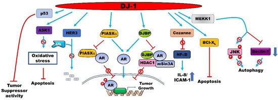 PARK7 enhances the proliferation and aggressiveness of cancer cells by regulating the activity of various proteins via a direct interaction (Figure 2). A study reported that ARs are the interacting partners of PARK7 in prostate cancer cells, and hormonal treatment enhances the formation of PARK7/AR complexes. PARK7 is drastically translocated into the nucleus following treatment with both androgens, including dihydrotestosterone (DHT), and antiandrogens including OH-flutamide and bicalutamide. PARK7 significantly increases the growth of prostate cancer in patients receiving androgen deprivation therapy as neoadjuvant hormone therapy in >6 months [].