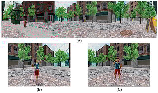 The virtual environment. (A) City street intersection; (B) visual (V) condition, boy’s avatar saying hello; (C) visual-auditory-olfactory (VAO) condition, boy’s avatar eating a muffin.